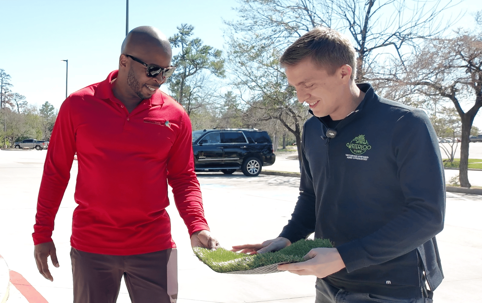 One of them is holding a 12-by-12 piece of turf
