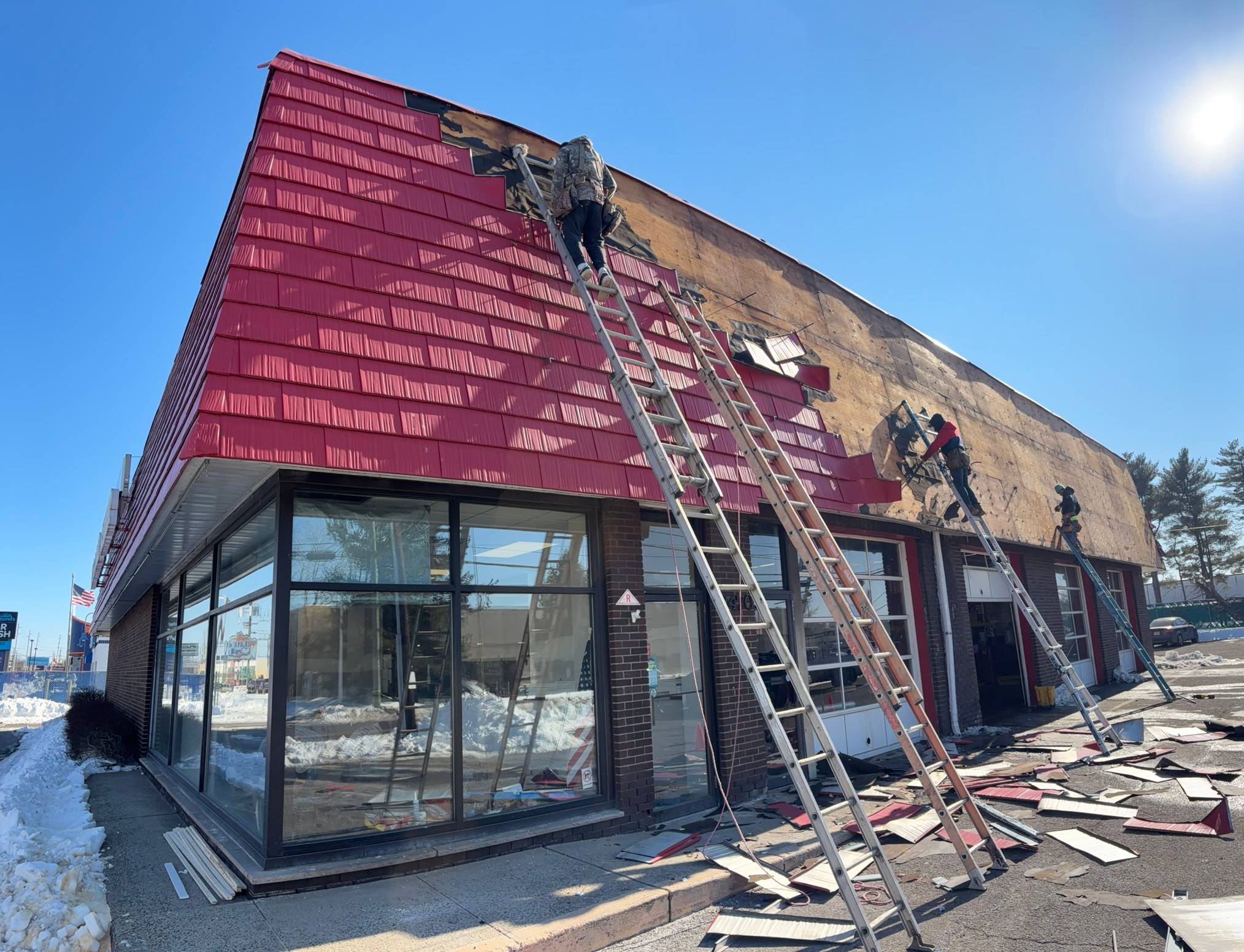Outside we installed temporary banners and ripped off the old pizza hut style roof ripped off.